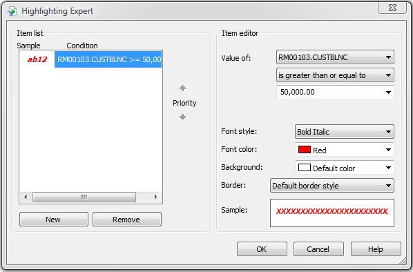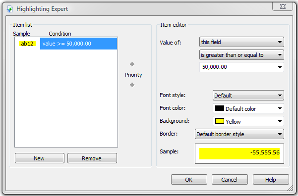 - Under Item editor select the conditions to check for and the color, font, background or border you want to display. Below is an example to simply highlight any amount $50,000 or greater in yellow: