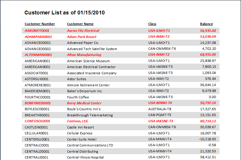 Note that I set the Background to Default Color, so that my alternate line shading is preserved. (Check out my Alternating shading for lines in Crystal Reports to see how to set up alternate shading.) - Click OK to close the Highlighting Expert window and your report will now look like this: