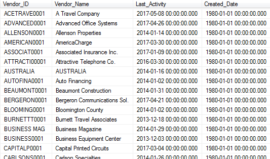 I have seen many requests recently for a way to see what Dynamics GP vendors have had no recent activity. Since ‘recent’ can mean different things, I thought I would put together a view that shows the last activity date for each vendor. Once you have this you can easily filter for whatever date range you need. I also added the date the vendor was created, since a brand new vendor might not have any activity yet.