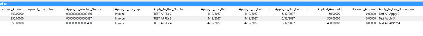 Technically in Dynamics GP you can only apply credits (payments, returns, or credit memos) to debits (invoices, misc charges, finance charges). There is no way to apply a credit memo to a payment, or a payment to a credit memo. So if you are only searching for the payment in the SmartList, you will only see the invoices it’s applied to. However, if you search for anything applied to invoice “TEST APPLY 2” you will also see the credit memo applied to it. At the time the payment is applied it will show you prior credits applied since the last time you posted a payment for that vendor, that is what you’re seeing on the posting report. However, the data is not stored this way in the apply tables. Hope that helps explain what you’re seeing.